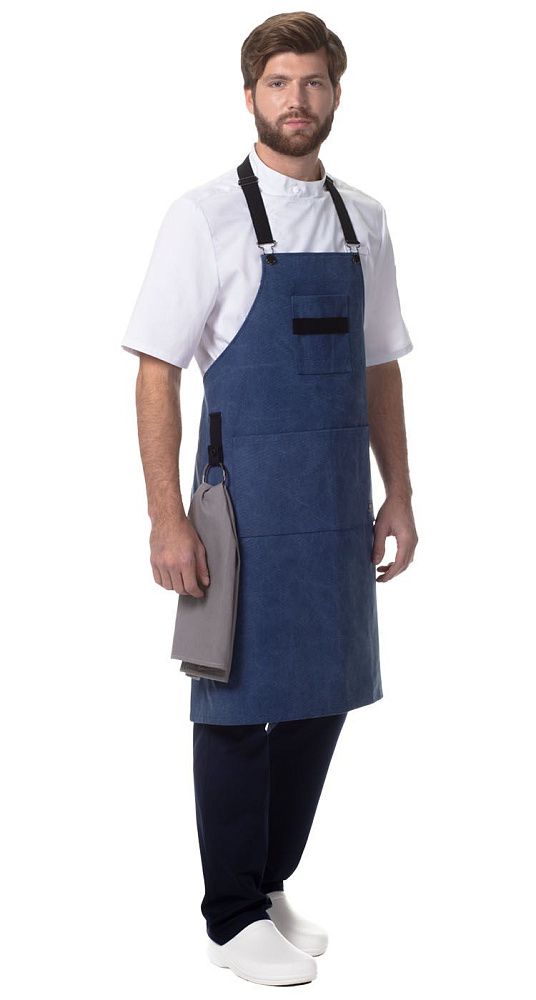 Фартук средней длины, с грудкой. Вокруг шеи съёмная бретель из тесьмы с регулировкой по длине, пристёгивается к грудке на металлические пуговицы пряжками. По бокам полупояса из тесьмы. На уровне груди накладной карман с 2-мя шлёвками из тесьмы для фиксации пинцетов, щипцов и т.д. На уровне бедер большой накладной карман с 2-мя отделениями и петля с металлическим кольцом для полотенца. Предусмотрена возможность снять кольцо для стирки изделия.